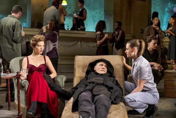 Dans un décor postapocalyptique, Les Crimes du futur (qui n’a rien à voir avec le film du même titre réalisé par Cronenberg en 1970) s’ouvre, après l’assassinat d’un enfant par sa mère qui sera plus loin au cœur du récit, sur un étrange couple d’artistes connu pour ses performances au cours desquelles Caprice (Léa Seydoux) tatoue en direct des organes de Saul (Viggo Mortensen) qu’elle va ensuite lui retirer pour en faire des œuvres d’art. Mais Caprice ne pratique pas ses ablations au hasard: les organes ainsi prélevés sont ceux que le corps de Saul ne cesse de fabriquer… Bienvenue dans l’univers de David Cronenberg et dans un monde où on ne ressent plus la douleur et où les corps mutent pour s’adapter à l’évolution. Dans l’ombre, le Registre national des organes, pour lequel travaille Timlin (Kristen Stewart), prend soin de recenser chaque mutation. La jeune femme est fascinée par l’idée que la chirurgie et la scarification ont remplacé le sexe.