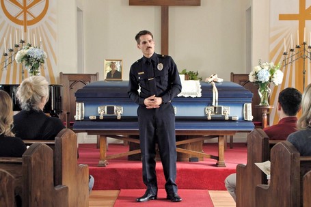 Thunder road, véritable météore cinématographique, s'ouvre sur une séquence d'anthologie, 10 minutes qui paraissent en roue libre et qui distillent subtilement, tour à tour, la stupeur, l'hilarité, le malaise – et pour finir une mélancolie mâtinée de sidération. Aussi poignante que drôle, la séquence d'une redoutable efficacité donne instantanément le ton tragi-comique, le rythme syncopé du film, et on redoute même un instant qu'il ne s'en remettra pas : trop gonflé, trop perché, impossible de tenir 90 minutes de même (allez, on vous rassure immédiatement : si, jusqu'au bout ça marche).